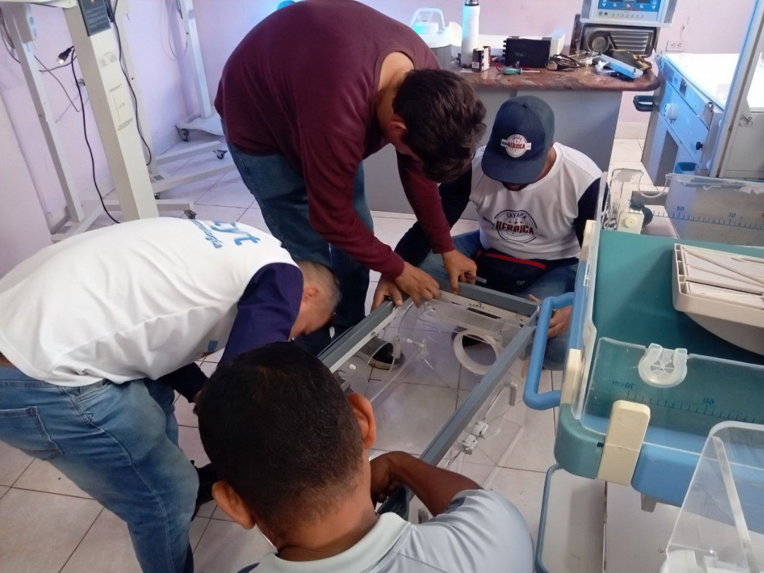 En la segunda jornada, el equipo técnico aplicó mantenimiento correctivo y recuperó dos lámparas de fototerapia neonatal marca Medix, dos incubadoras Medix PC-305 y un respirador pediátrico marca Dräger.